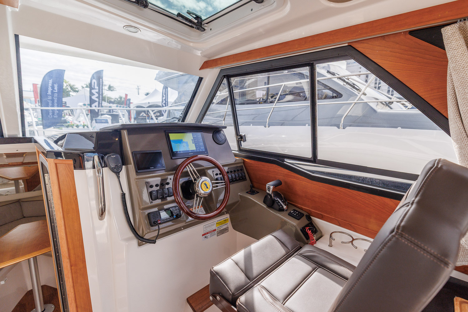 The C-248 C comes comfortably equipped to cruise and play. Standard features include a navigation package starring the 9" Garmin GPS chartplotter with sonar, color Yamaha engine display, VHF radio, Bluetooth-enabled Fusion stereo system, LED lighting, marine head with holding tank, sport racks, built-in rod holders, fish box, integrated transom cooler, concealed ski tow, our built-in trailer lights, foldaway cockpit seating, cockpit bolster cushions, and much more.