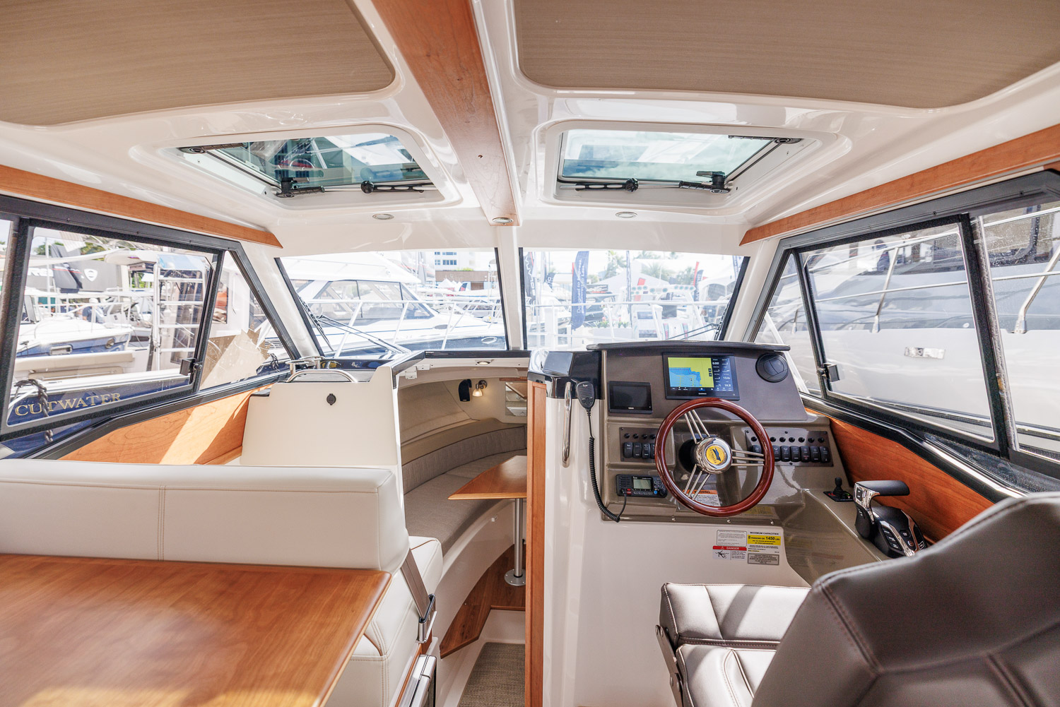 The new C-248 Coupe from Cutwater Boats presents a beautiful, contemporary twist on a classic Downeast design. This versatile outboard-powered cruiser offers an abundance of features designed to make cruising, fishing, and entertaining fun and stress-free. The C-248 C offers a 360-degree view from the helm as well as an innovative aft bulkhead window that opens, allowing the dinette seat to transform into a rear-facing cockpit seat. Onboard the C-248 C you’ll enjoy all the comforts of home with a private stateroom, head, and galley featuring a sink with hot and cold water, stove top, microwave, and refrigerator/freezer.