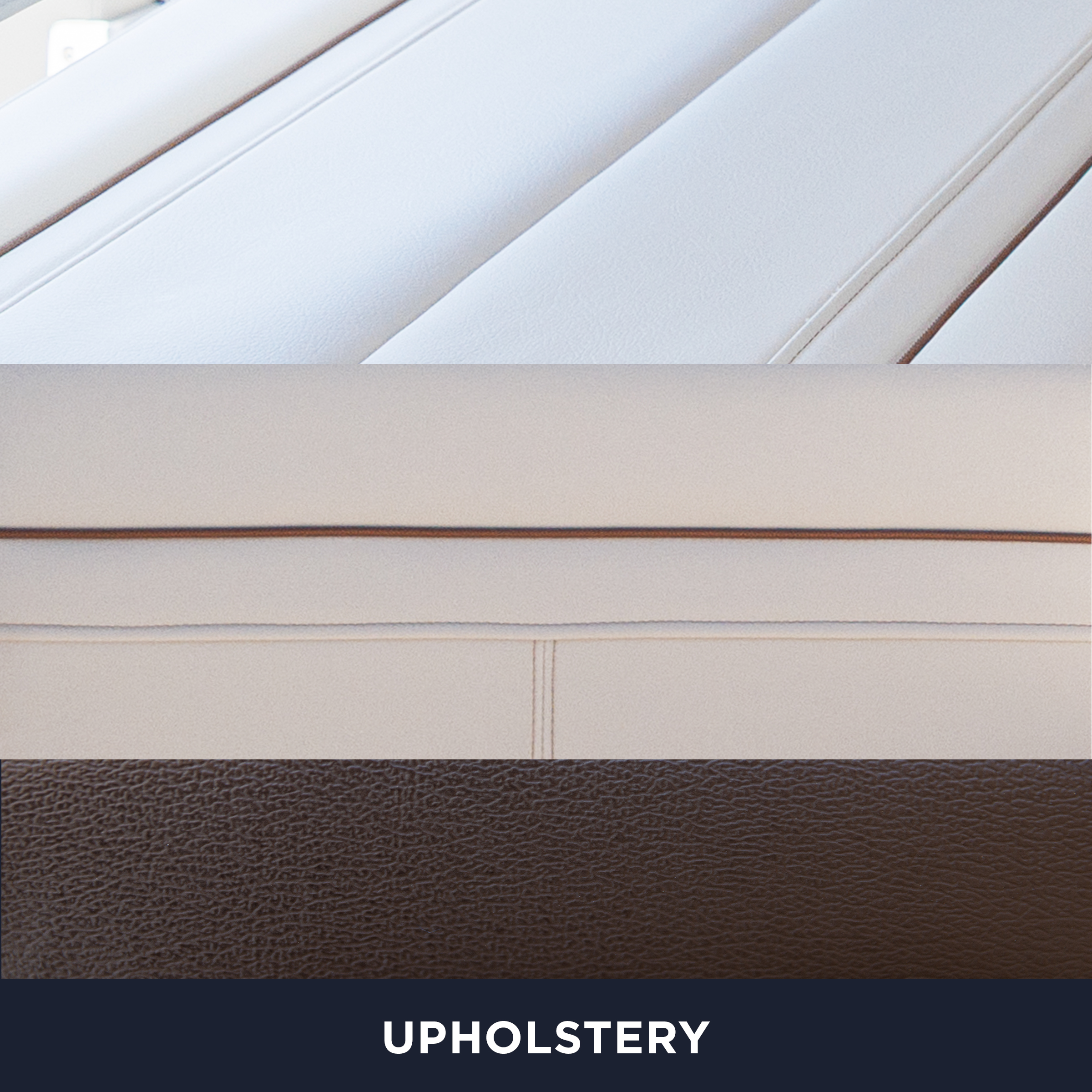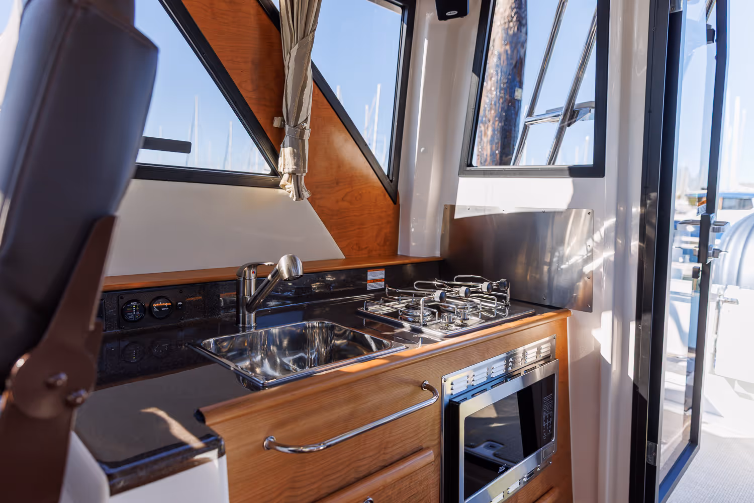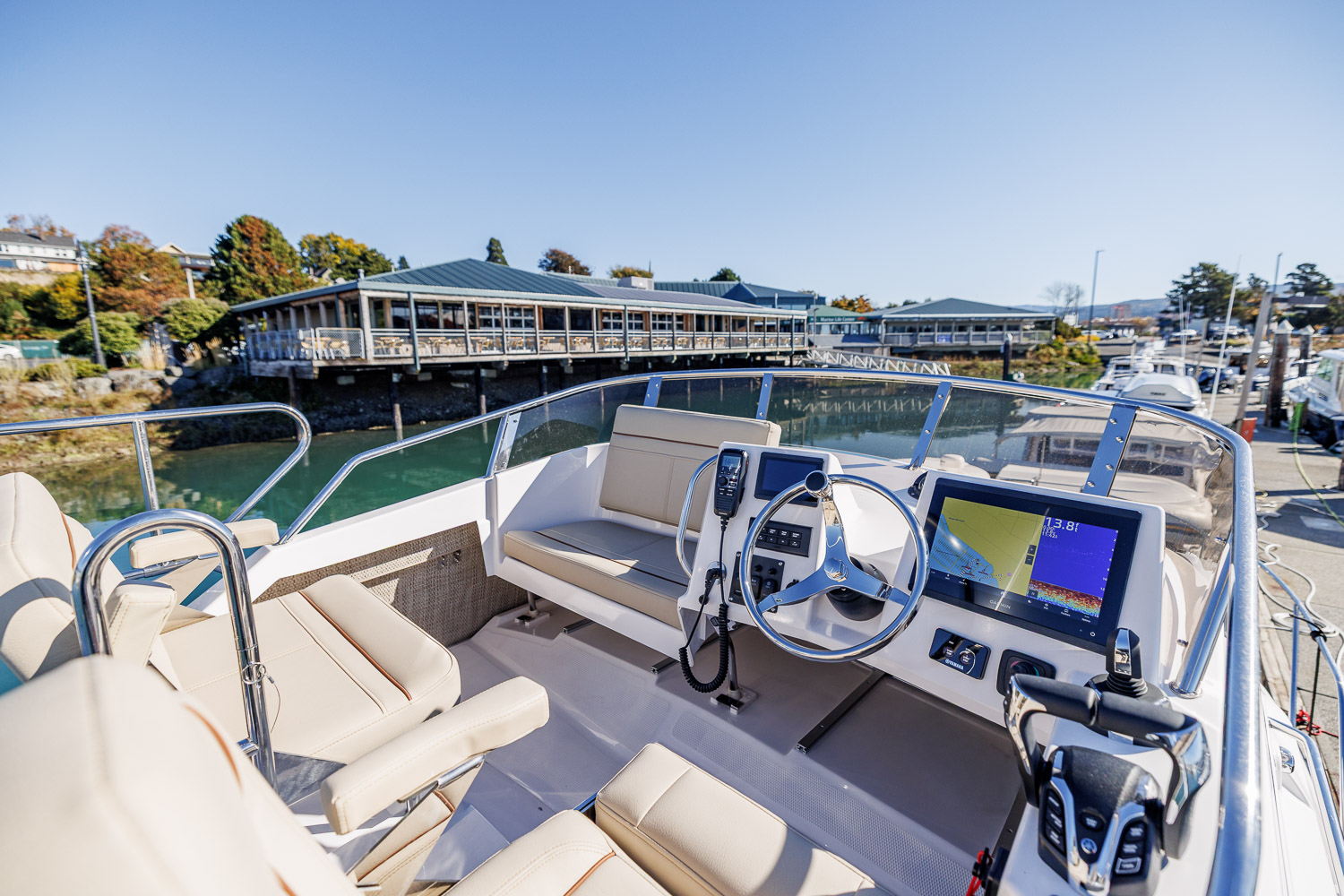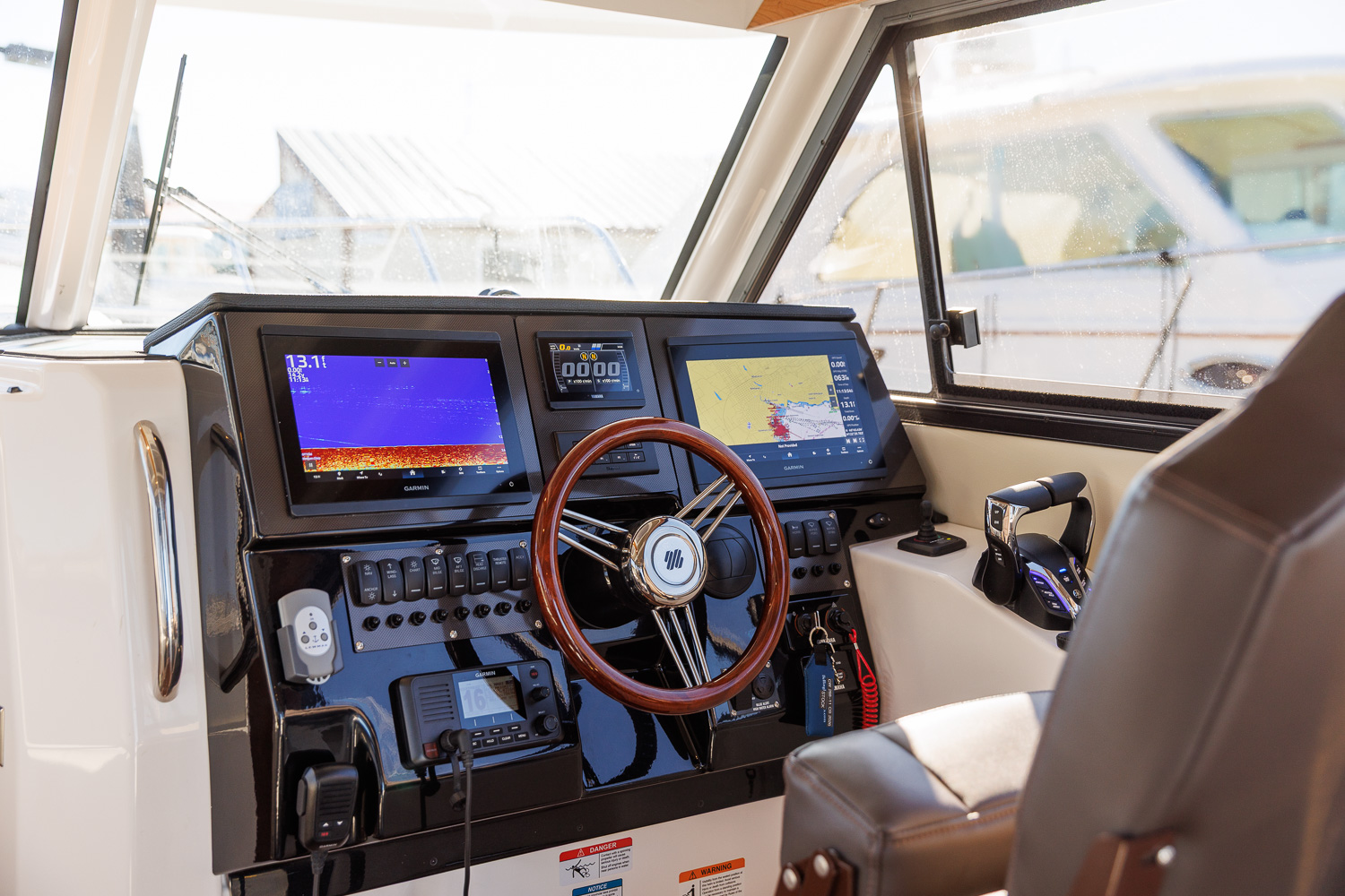 Step inside the salon and you’ll find your home on the water, with a full galley featuring a stovetop, stainless-steel sink with pull-out rinse faucet, fridge/freezer combo, microwave convection oven, cabinetry, and a wine/water cooler. The helm is a Captain’s dream with a Garmin chartplotter, autopilot, sonar, xHD radar, color engine displays and a twin-lever electronic throttle control.