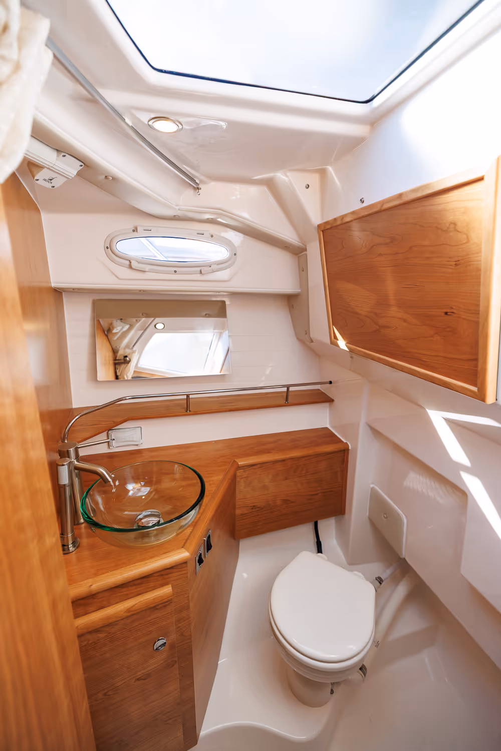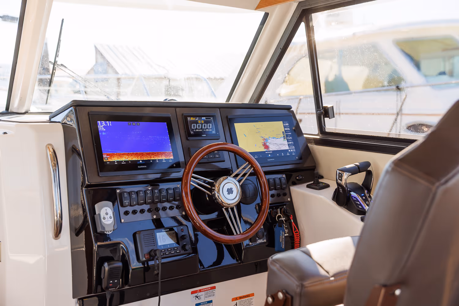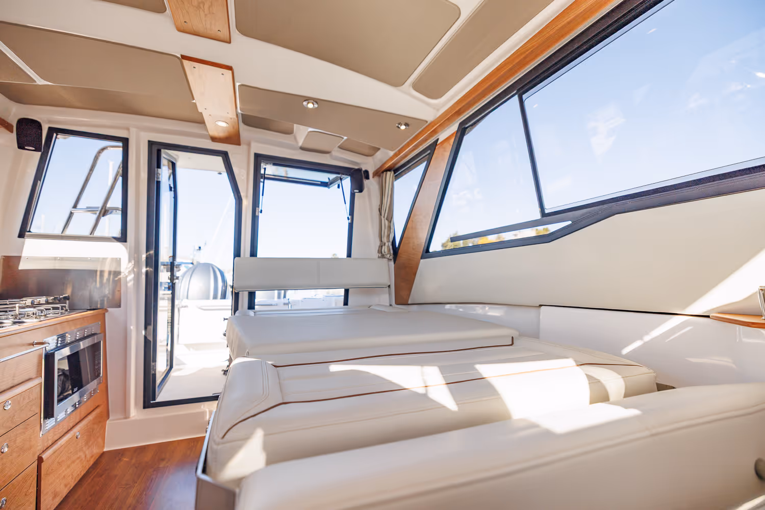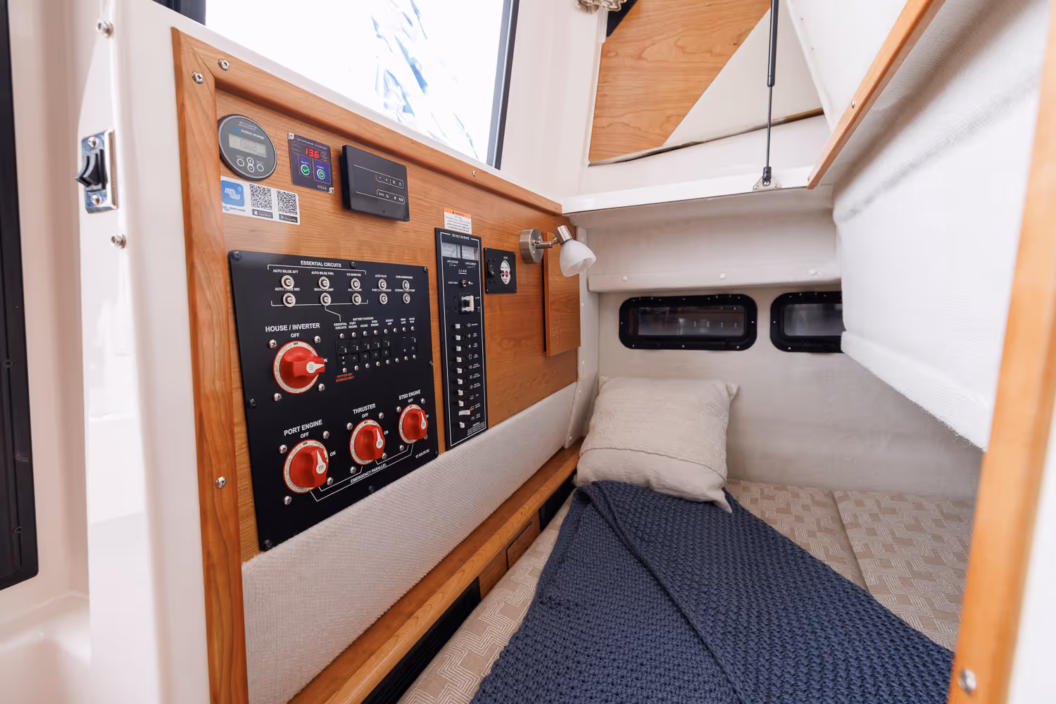 From the cockpit, the Secure-step ladder leads to the Command Bridge. Perched above the hardtopis a second helm station with full Garmin electronics suite, VHF, bow thruster controls, and comfortable seating for up to four guests. Whether underway or at anchor, the Command Bridge offers an elevated vantage point with panoramic views and a social atmosphere, making it the perfect place to navigate, relax, or enjoy a sunset cruise.